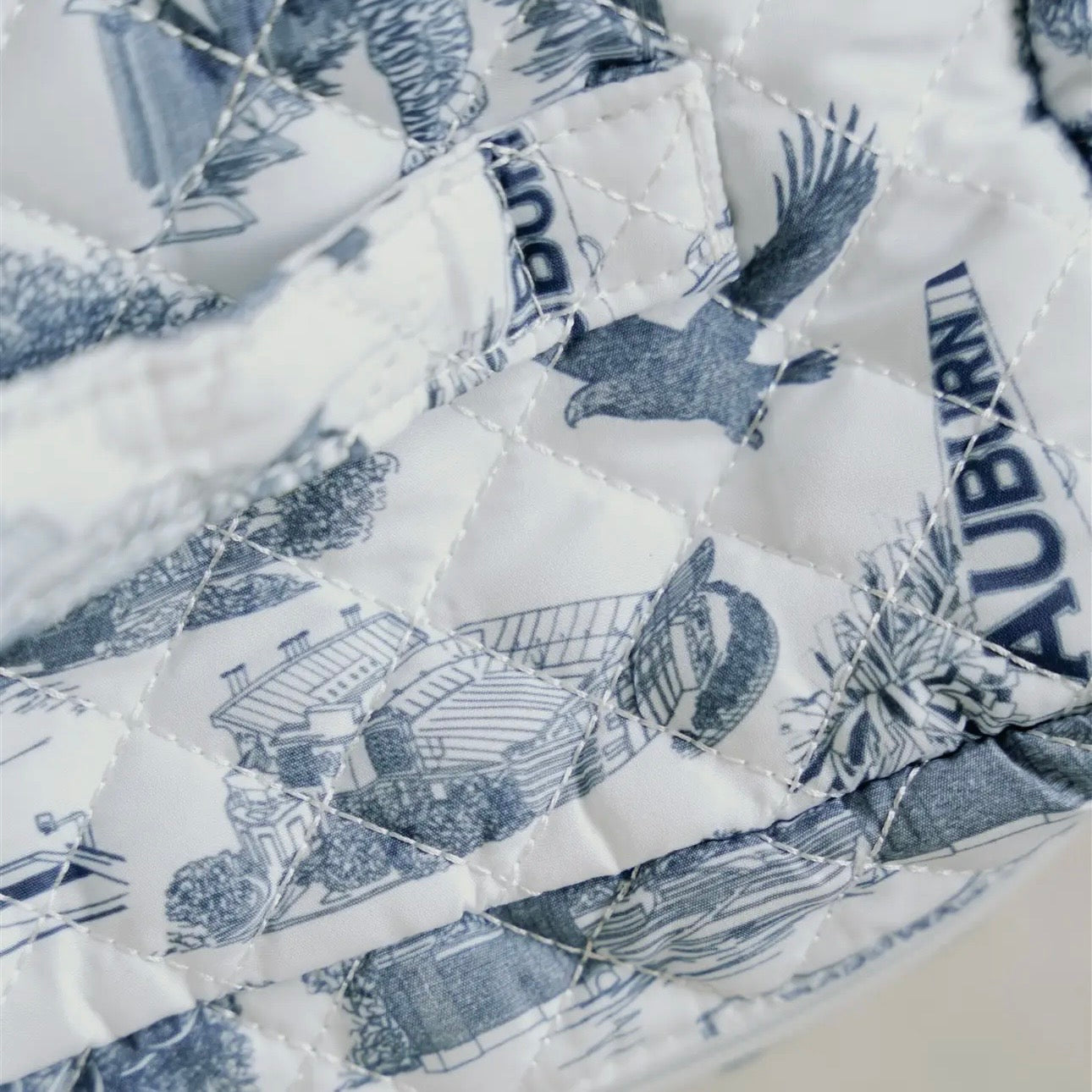 This 10x7x6 inch make up bag is perfect for Auburn fans everywhere! The large toiletry bag features a handle on top and an inside pocket. The bag is white with navy illustrations of Auburn icons, such as Toomer's oaks, Jordan-Hare Stadium, Aubie, and Samford Hall!